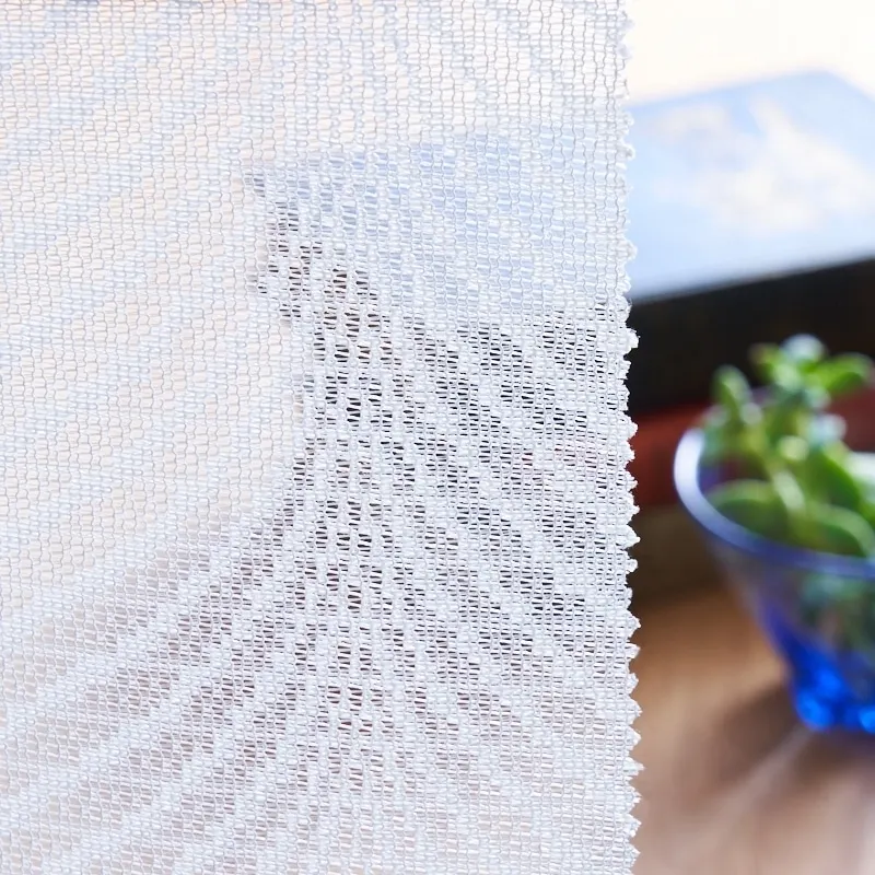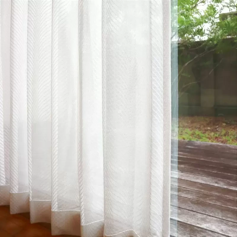 ミラー・UVカット機能付きのレースカーテンです。細かいダイヤが連なった独特の柄でタテのストライプが表現されたレースです。縦のラインの一部にきらりと光るラメ糸が使用されています。