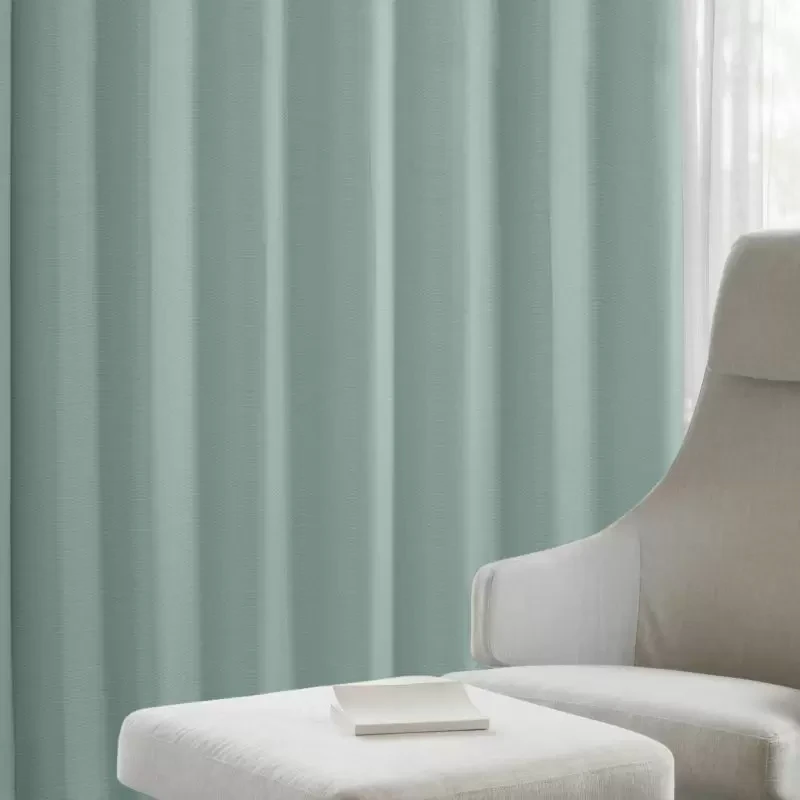 光沢感がありヨコの方向に細かくボーダーが入っております。生地感と色合いがモダンでありどんなお部屋にも使いやすいオススメの遮光カーテンです。