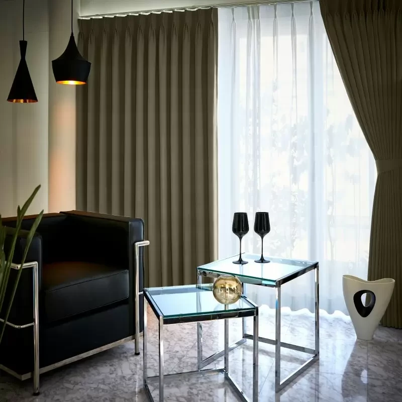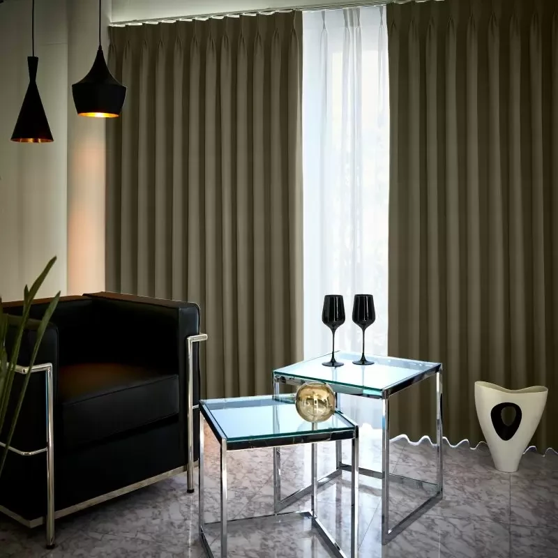 光沢感がありヨコの方向に細かくボーダーが入っております。生地感と色合いがモダンでありどんなお部屋にも使いやすいオススメの遮光カーテンです。