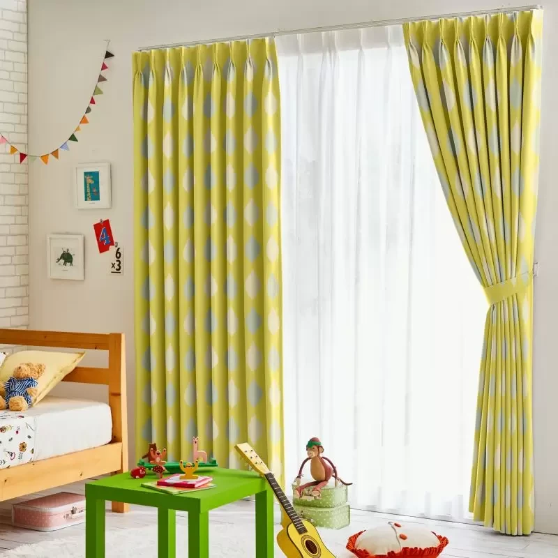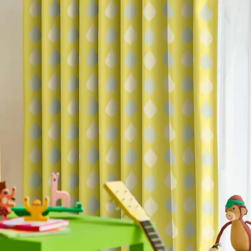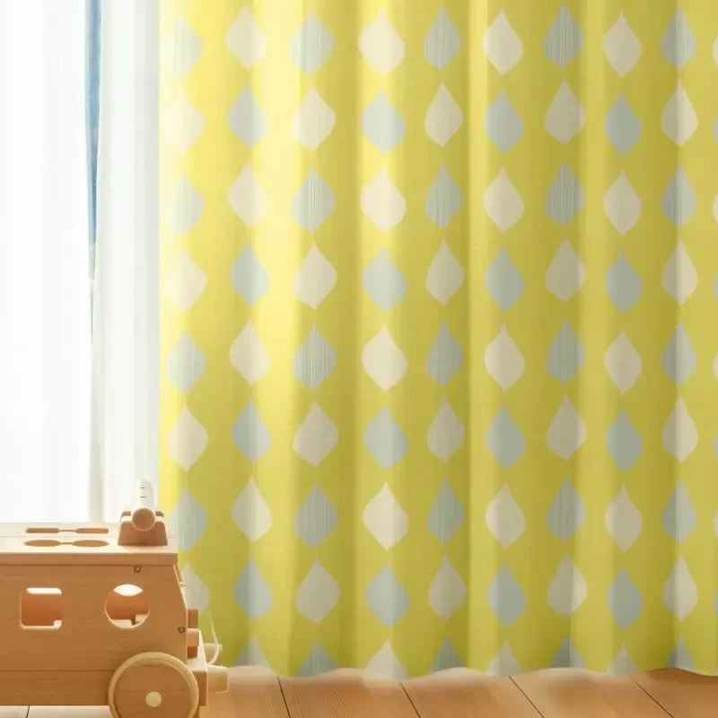 雨粒とお菓子のドロップをモチーフにした、キュートなデザイン。北欧インテリアにマッチする、ややグレイッシュなトーンで、子供部屋だけでなく、女性のお部屋やリビングと、幅広くお使いいただけます。遮光機能付きで常に売れ筋ランキング上位に入る人気商品です。