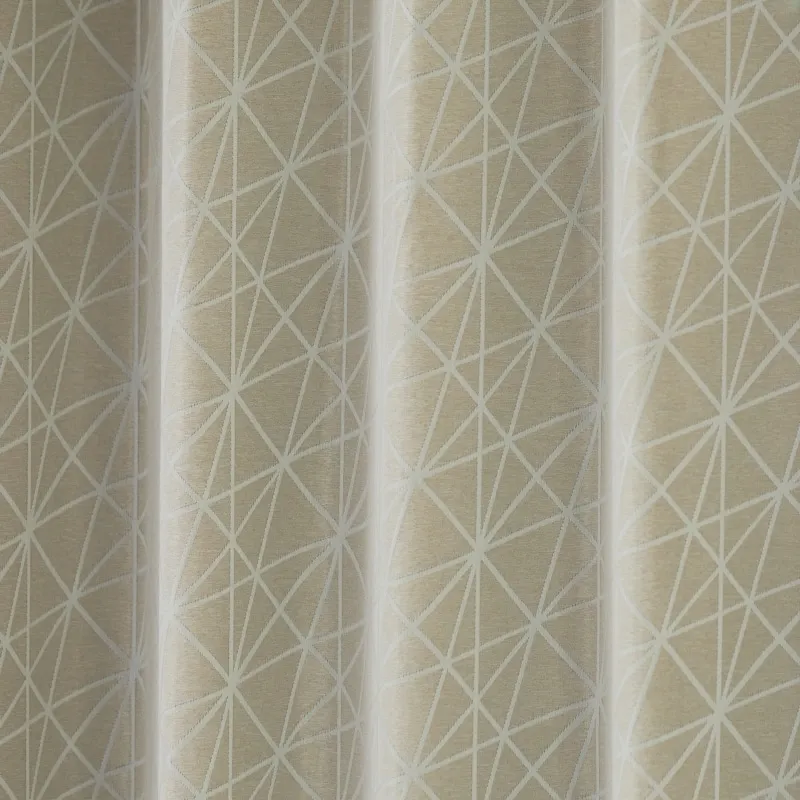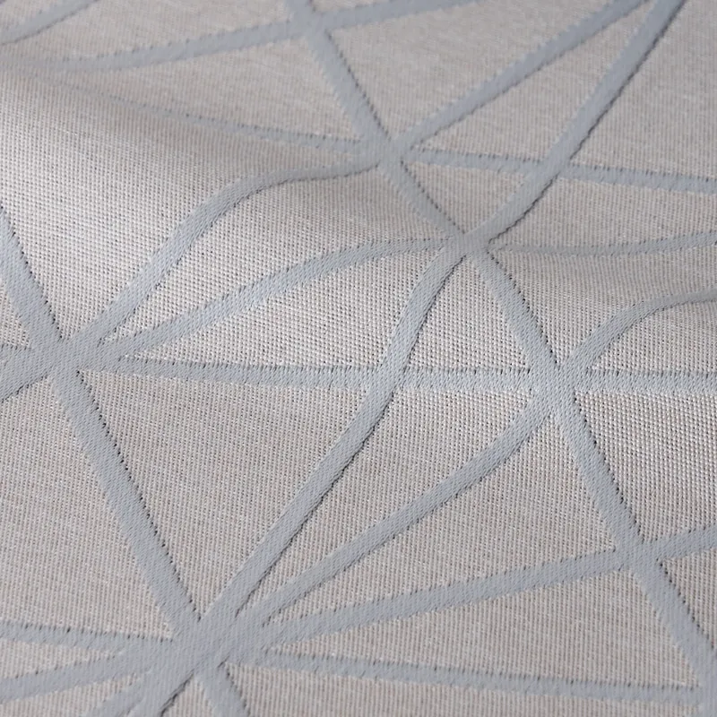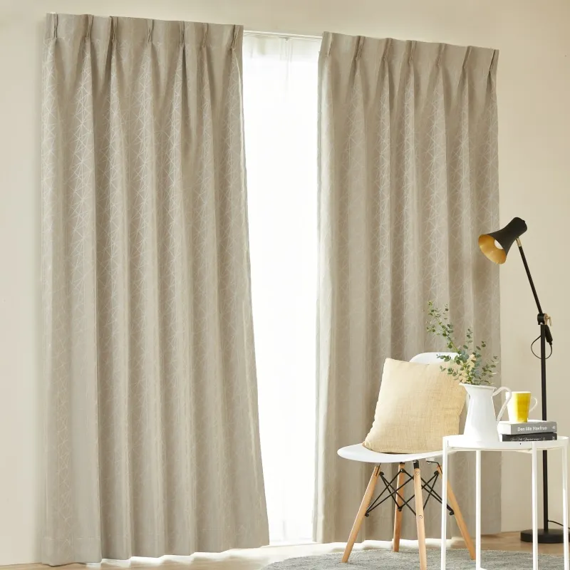 レーザービームを交差させたような、シャープでスタイリッシュな幾何紋様が美しい、小紋柄シリーズ遮光ドレープです。織りから染めまでの工程をすべて日本国内で行っており、品質は折り紙付きです。