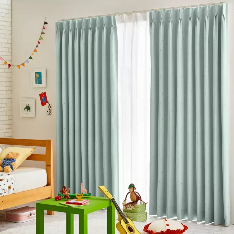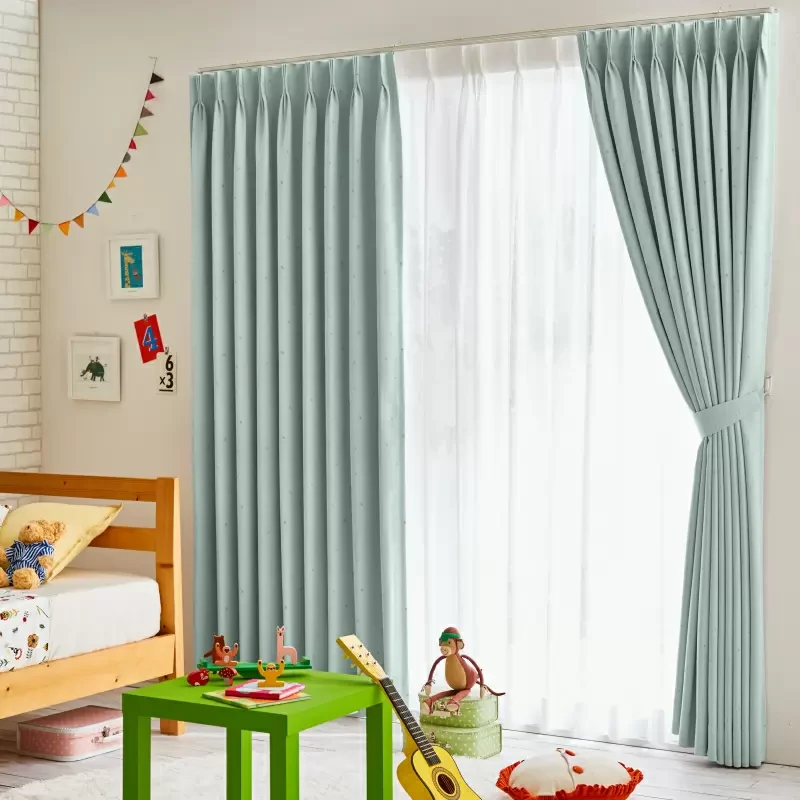 なめらかな手触りの遮光生地に、フォイルプリント(箔転写)で夜空にキラキラと瞬く星や月のデザインを表現したドレープです。グラウンドにもグリッター状に細かな箔がちりばめられ、まるで天の川のように煌びやかです。星が金色になります。同シリーズのレース、トゥインクル・スター・シアーとのペアづかいがおすすめ。星は金色となります。