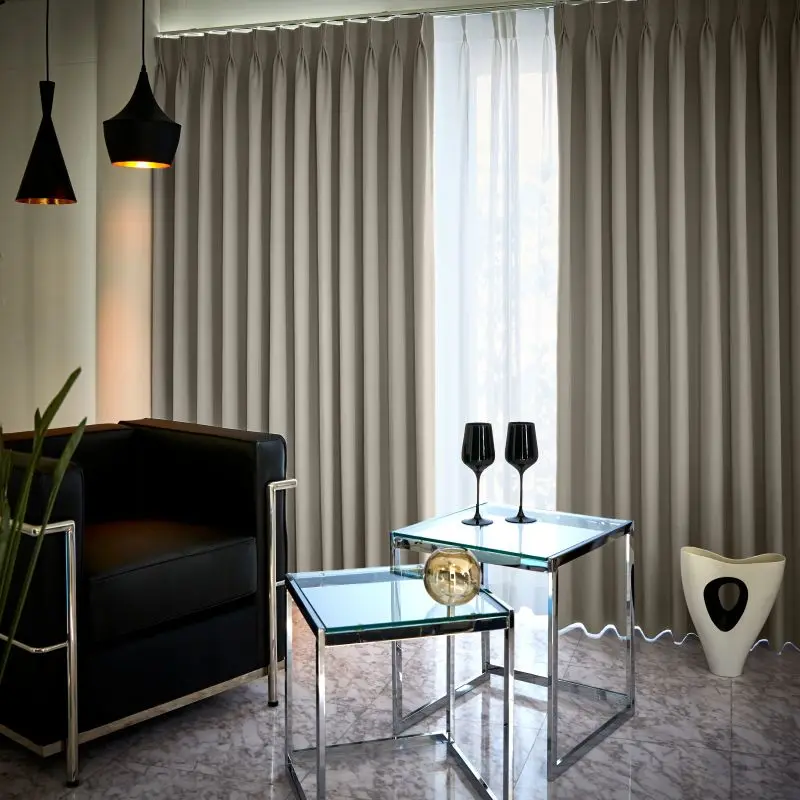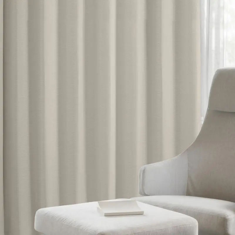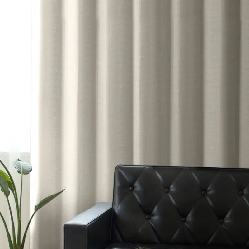 光沢感がありヨコの方向に細かくボーダーが入っております。生地感と色合いがモダンでありどんなお部屋にも使いやすいオススメの遮光カーテンです。