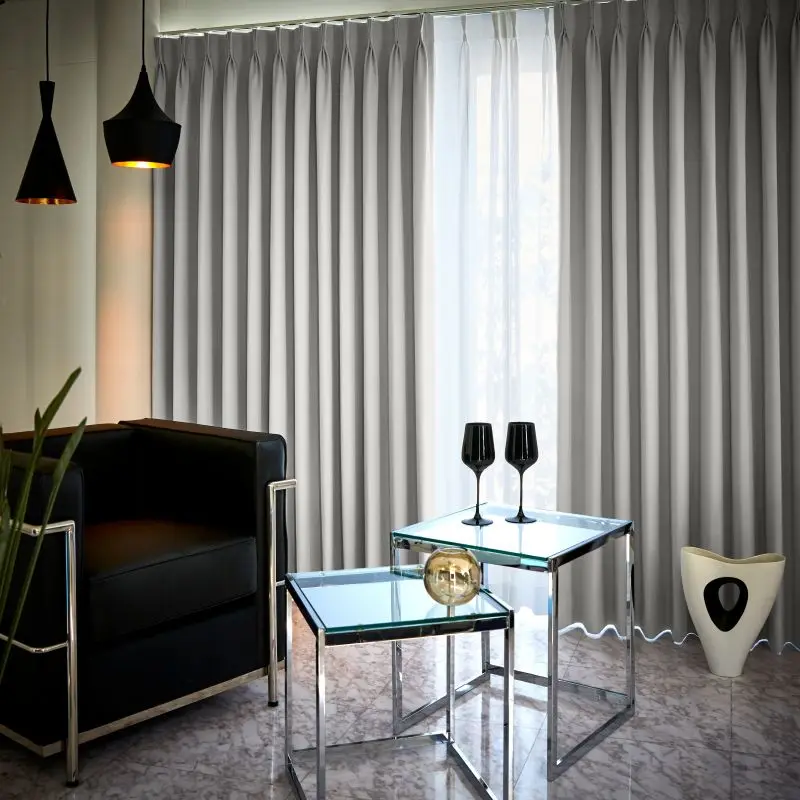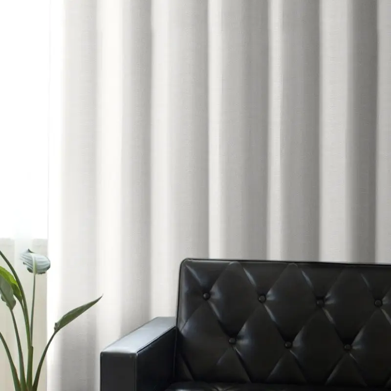 光沢感がありヨコの方向に細かくボーダーが入っております。生地感と色合いがモダンでありどんなお部屋にも使いやすいオススメの遮光カーテンです。