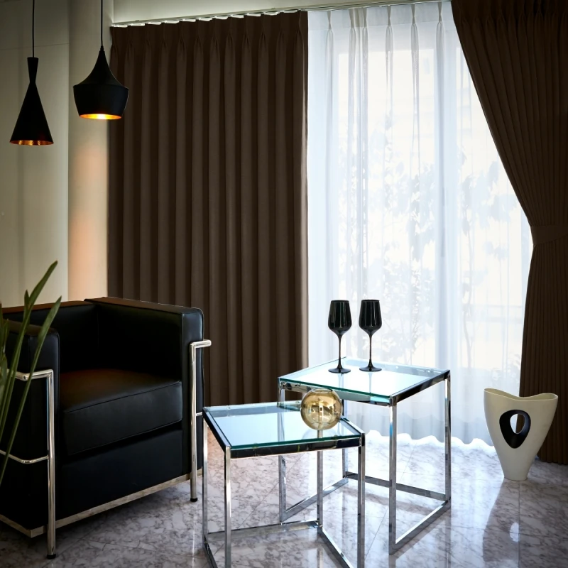 落ち着いた色味をベースにしながら、絶妙なミックス感がある色で、きらりと光る縦のラインとあいまって、上質さを感じさせるカーテンです。オトナカジュアルなインテリアに是非お選びください。
